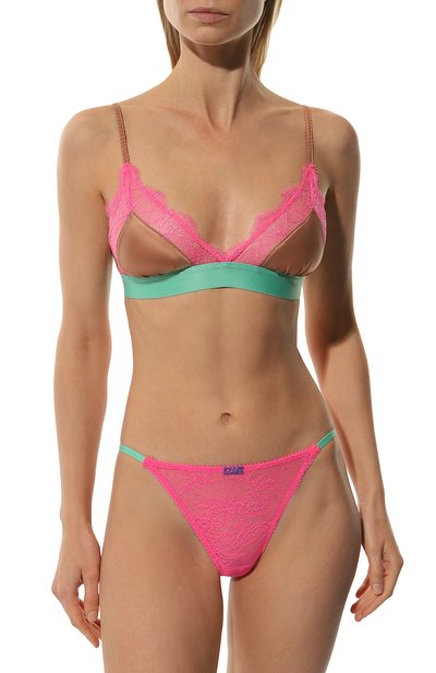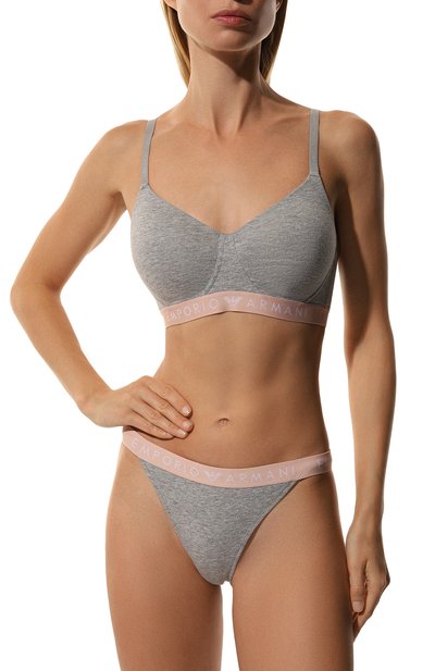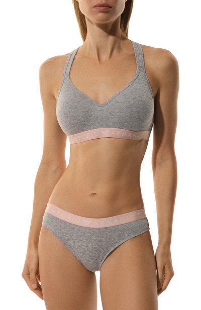 Бюстгальтер с регулируемыми узкими бретелями и съемными формованными вставками сшит из меланжевого хлопкового джерси. Широкий пояс украшен спереди брендированным патчем.