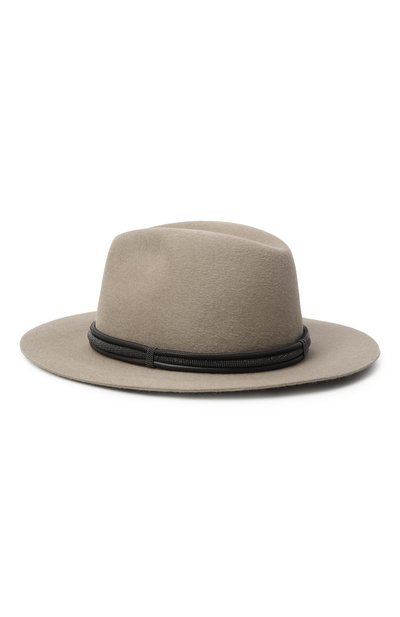 Для изготовления черной шляпы-федоры с широкими гибкими полями использовали плотную шерсть. Ленту грогрен, которой дополнили изделие, декорировали миниатюрной накладкой с выгравированным логотипом бренда.