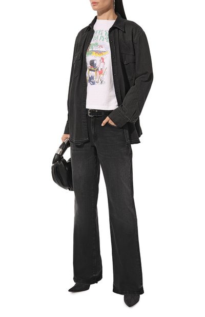 Расклешенные джинсы с завышенной посадкой предлагаем носить с поло и балетками. Выбеленные брюки сшили из денима средней плотности. Пояс и один из пяти карманов сзади декорировали фирменным патчем и накладкой в виде тотемного орла.