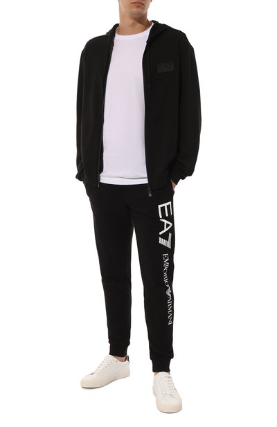 Джоггеры с широкими эластичными поясом и манжетами выполнены из гладкого смесового текстиля стрейч. Врезные карманы, застегивающиеся потайными молниями, отделаны контрастным кантом. Брюки украшены сбоку небольшим патчем с логотипом бренда.