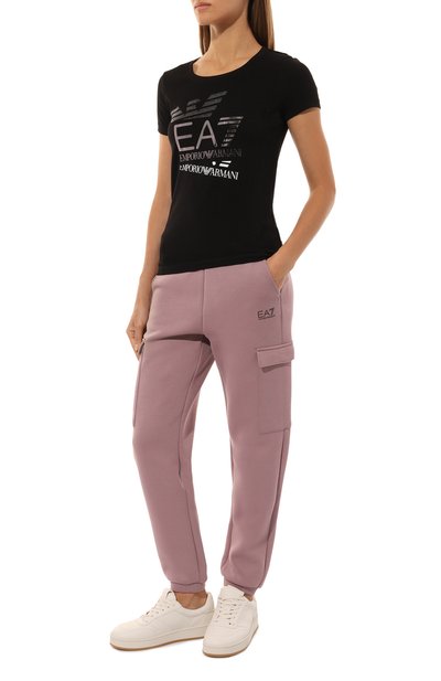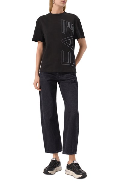 Черную футболку из эластичного хлопкового джерси украсили символикой бренда в тон. Крупное название линии EA7 составили из стразов, а под ним напечатали сияющий логотип Emporio Armani.