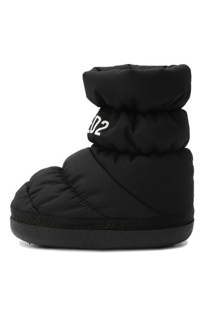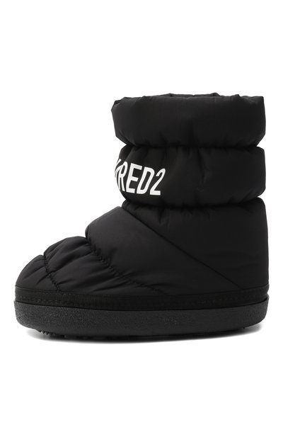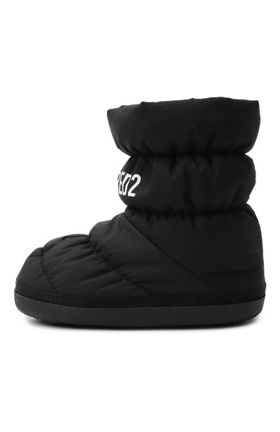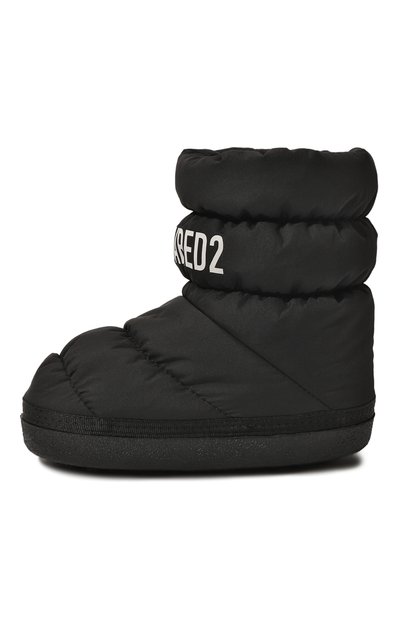 Для изготовления стеганых мунбутов использовали прочный непромокаемый полиэстер. Утепленную модель поставили на широкую подошву с устойчивым протектором, не пропускающую холод от земли. Сапоги украсили контрастным логотипом марки спереди.