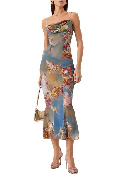 Серебристые босоножки из металлизированной кожи станут удачным завершением наряда на выход. Модель с союзкой, собранной из узких лент, и регулируемым ремешком, подчеркивающим щиколотку, установили на высокую хромированную шпильку.