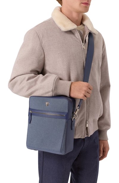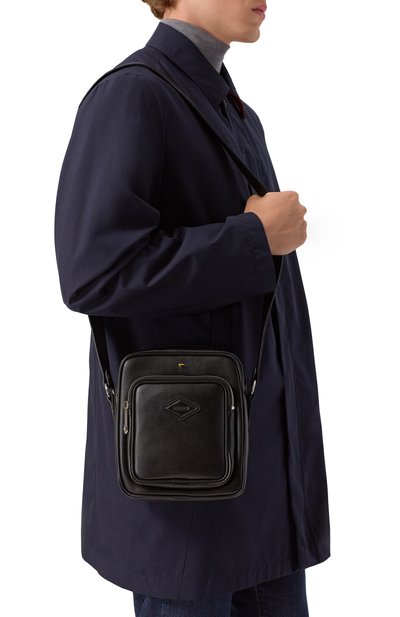 Сумку Mythos с короткой ручкой и текстильным плечевым ремнем выполнили из переработанной воловьей кожи. Модель дополнили накладным карманом в основном отделении и парой слотов для карт во внешнем кармане на молнии, декорированном фирменными полосами.