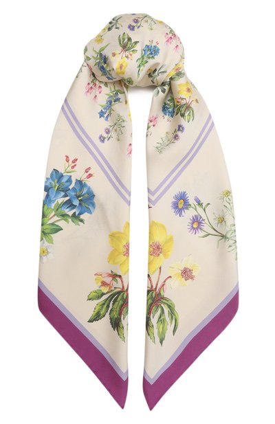 Квадратный платок с пастельным цветочным принтом Swiss blooms и узким кантом сшили из шелкового твила. Такой аксессуар станет цветовым акцентов в образе из о днотонных вещей.