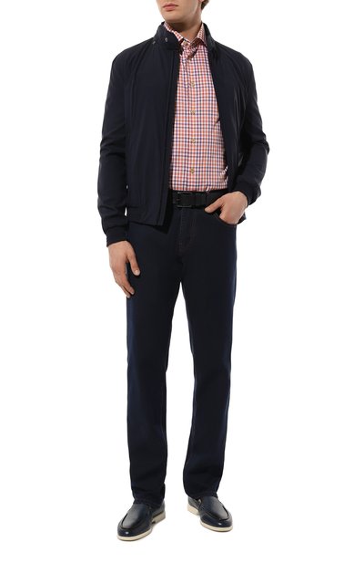 Джинсы кроя Regular fit сшили из эластичного денима плотностью 11,5 унций. Сзади на широком поясе брюк с пятью карманами расположили кожаный патч с логотипом.