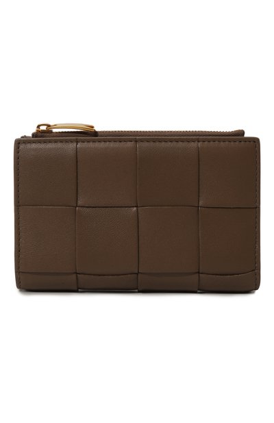 Портмоне с одним отделением для купюр, десятью слотами для пластиковых карт и четырьмя карманами для чеков и документов выполнено из широких полос матовой ягнячьей кожи наппа. Карман для монет застегивается молнией, а сам аксессуар — кнопкой.
