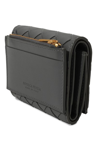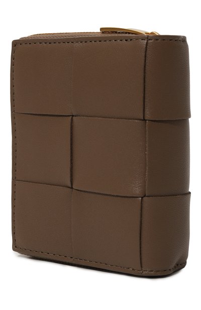 Кошелек, застегивающийся золотистой молнией, выполнили в технике intrecciato из тонкой кожи ягненка. Внутри разместили восемь слотов для кредитных карт, четыре отделения для купюр и чеков и карман для монет.