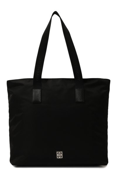 Сумка-тоут из легкого текстиля подойдет для хранения ежедневника, кошелька и складного зонта. Изделие на молнии дополнили двумя парами ручек. Лицевую панель украсили фирменным логотипом. Внутри — отделение для ноутбука и плоский карман.