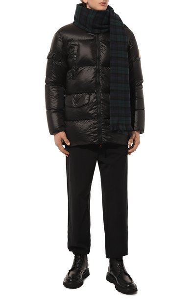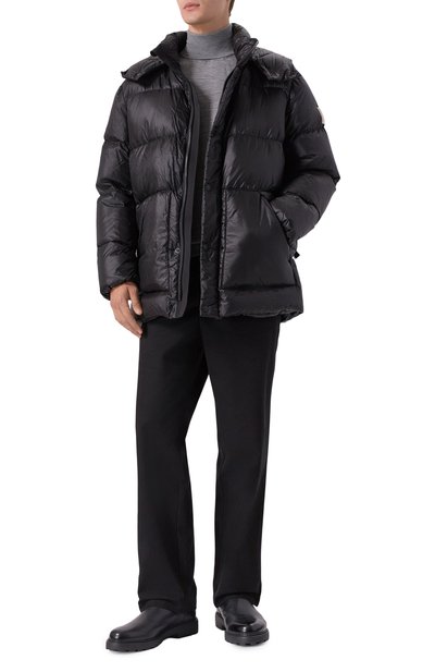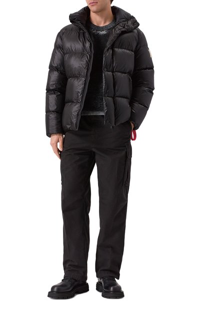Объемный пуховик с двумя внешними и четырьмя внутренними карманами сшит из глянцевого нейлона с водоотталкивающим покрытием. Стеганая легкая куртка, утепленная утиным пухом с добавлением пера, дополнена отстегивающимся регулируемым капюшоном и съемными эластичными лямками. Левый рукав украшен патчем с логотипом бренда.