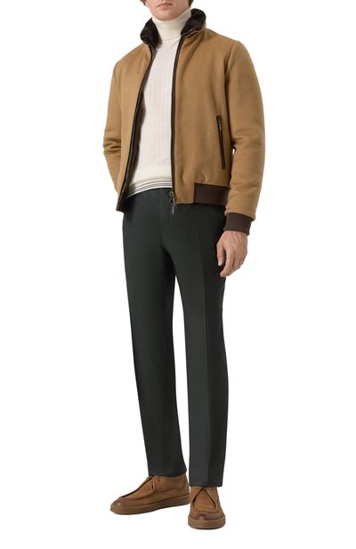 Лаконичные темно-зеленые брюки станут основой как офисного комплекта, так и повседневного образа. Модель со стрелками выполнили из мягкого шерстяного твила. Дышащий материал поддерживает оптимальный микроклимат и почти не мнется. На поясе есть узкие ремешки, позволяющие отрегулировать посадку на талии.