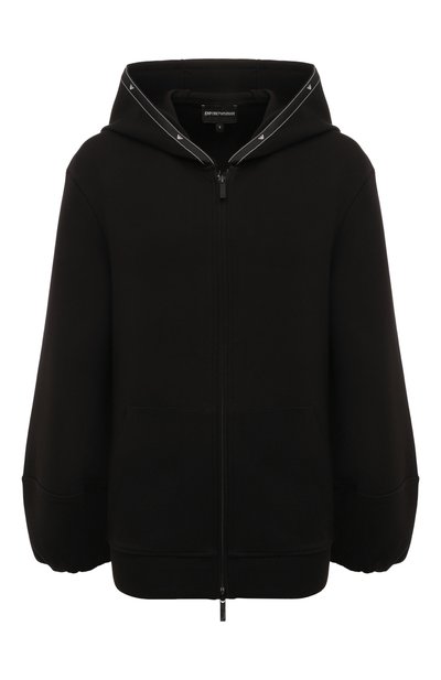 Свободную толстовку с широкими манжетами сшили из плотного хлопкового трикотажа, усиленного стрейчевыми волокнами и прочным полиэстером. Модель с накладными карманами украсили на капюшоне лентой с контрастным паттерном в виде фирменного тотемного орла.