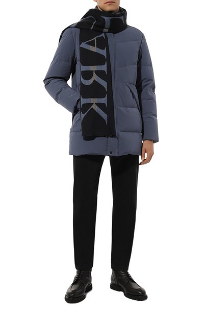 Шарф из шерстяной пряжи украсили контрастным жаккардовым логотипом на концах. Длины аксессуара хватит, чтобы завязать французский узел.