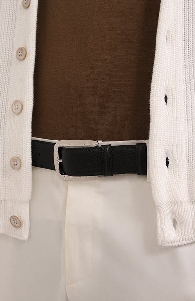 Двусторонний узкий ремень дополнен металлической пряжкой с эмалевым покрытием, золотистым логотипом марки и кобурной кнопкой. Одна сторона аксессуара изготовлена из лакированной фактурной кожи каймана, другая — из телячьей с гладкой матовой поверхностью.