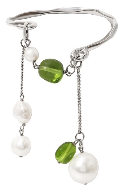 Серебристый браслет, дополненный цепочками, изготовлен из латуни с гальваническим покрытием серебром. Аксессуар декорирован подвесками из культивированного жемчуга и прозрачного зеленого стекла.