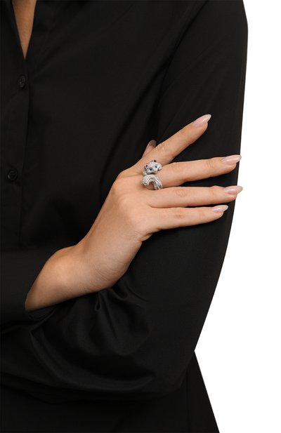 Жесткому незамкнутому кольцу придали форму кошки с пушистым хвостом и контрастным бантом. Аксессуар из отполированной латуни покрыли глянцевой эмалью.