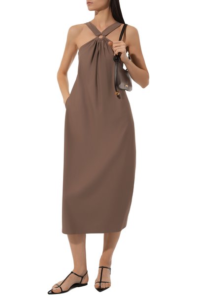 Двубортное миди-платье с боковыми карманами и ремнем выглядит как тренч без рукавов. Для пошива модели со шлицей использовали г абардин из шерсти первого пострига. Изделие с тонким подкладом из ацетата и полиэстера можно носить сольно или как жилет.