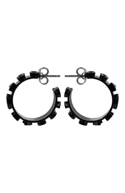 Серьги-полукольца выполнили из латуни с гальваническим покрытием серебром. Широкий аксессуар украсили рельефным логотипом бренда, акцентированным матовой эмалью.