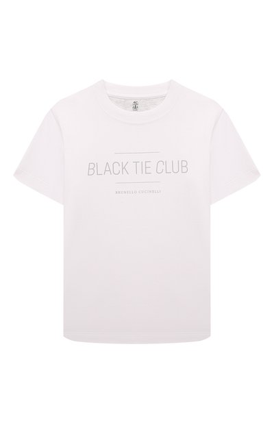 Для пошива белой футболки с круглым вырезом использовали хлопковое джерси. Спинку на изнанке дополнили меланжевой вставкой с эмблемой бренда. Спереди модель украсили логотипом марки и надписью Black Tie Club.