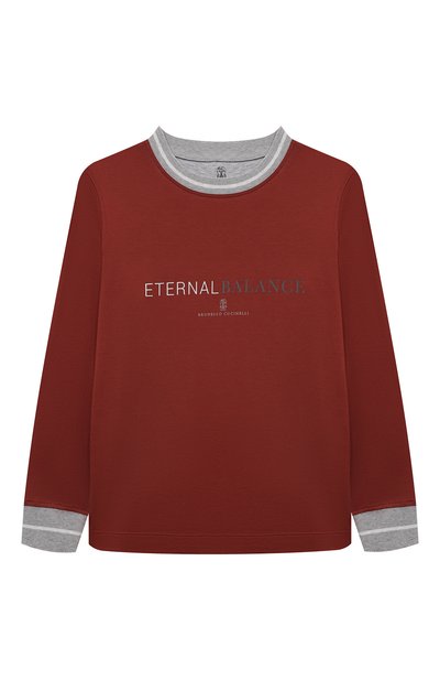 Прямой лонгслив выполнили из хлопкового трикотажа. Спереди модель украсили текстовым принтом с логотипом и геральдической эмблемой бренда, с которыми зарифмовали манжеты и отделку вдоль выреза в рубчик.