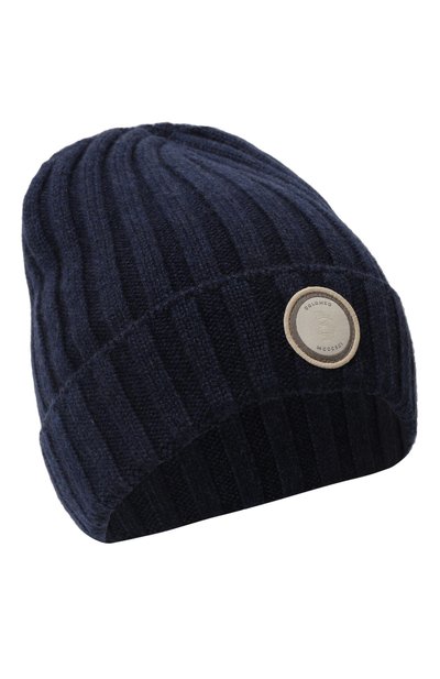 Для изготовления шапки с широким отворотом использовали фактурный кашемировый трикотаж. Изделие декорировали круглым патчем с эмблемой бренда и датой основания Соломео, где была создана марка.