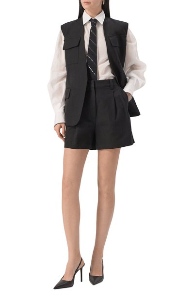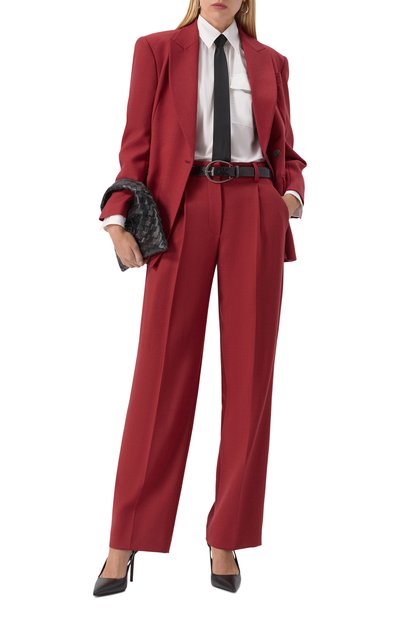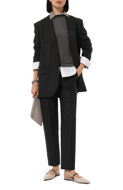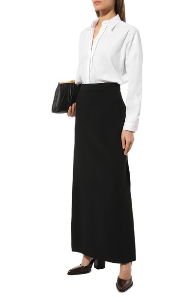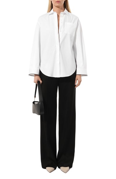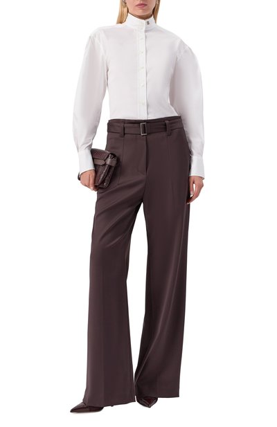 Приталенная рубашка из хлопкового поплина будет органично смотреться и с брючным костюмом, и в сочетании с романтичной юбкой. Модель с объемными длинными рукавами дополнили высоким стеганым воротником-стойкой с полосой, вышитой знаковыми для марки цепочками мониль.