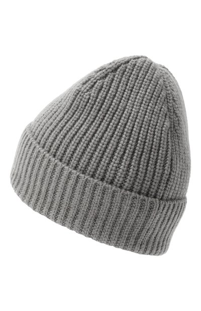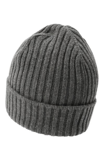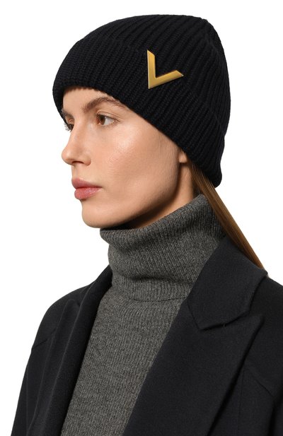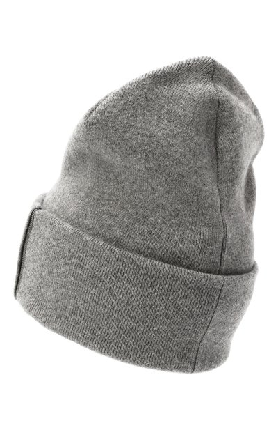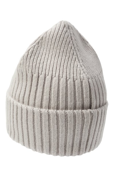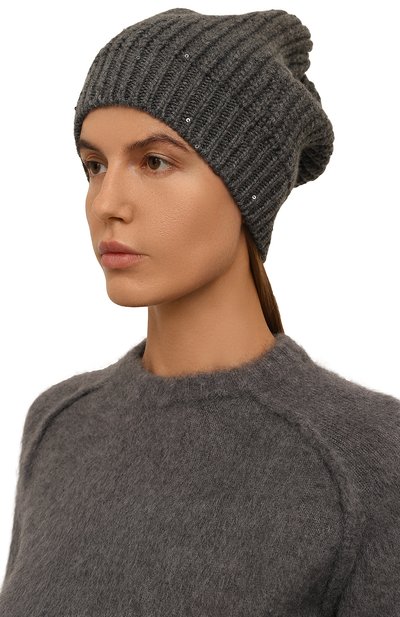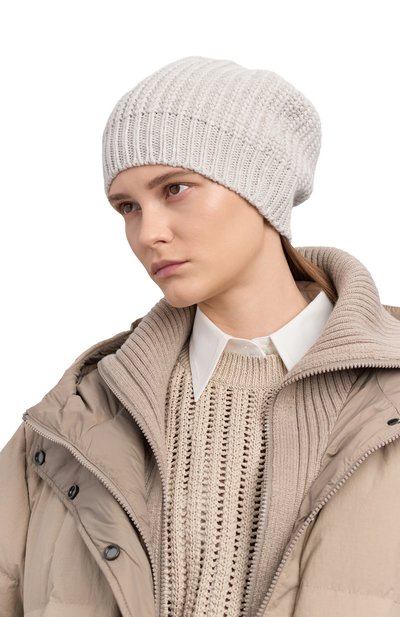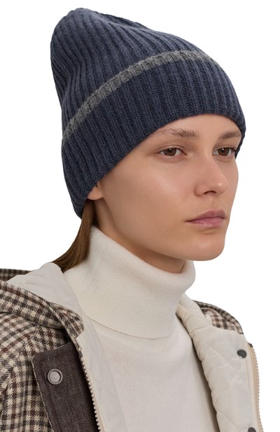 Шапку бини связали английской резинкой из кашемировой пряжи. Широкий отворот аксессуара украшен контрастным кантом и петлей из фирменных цепочек мониль.
