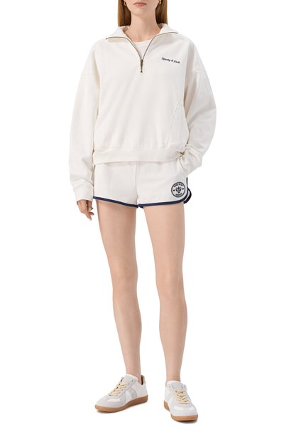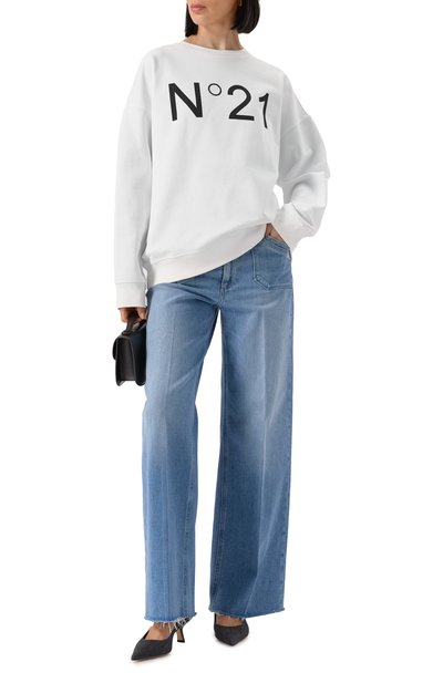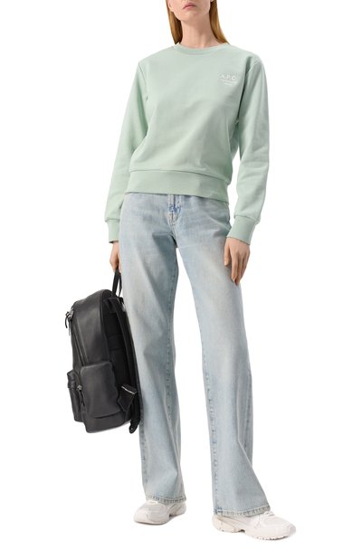Светло-зеленый свитшот выглядит предельно лаконично: единственным элементом декора стала миниатюрная серебристая эмблема марки спереди. Для пошива свободного изделия со спущенной линией плеч использовали приятный на ощупь хлопковый трикотаж с фактурной изнанкой. Наши стилисты предлагают сочетать модель с серыми джинсами, черными туфлями и сумкой.