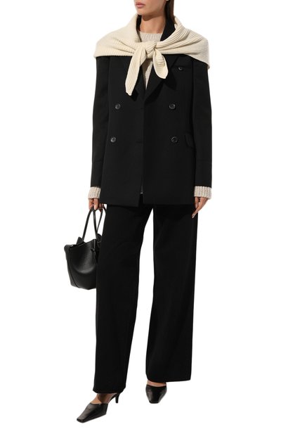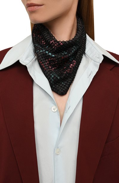 Треугольный платок, напоминающий короткую накидку, сшили из шелкового твила. Аксессуар, застегивающийся на пуговицу, декорировали графичным принтом в виде женской прически с косами.