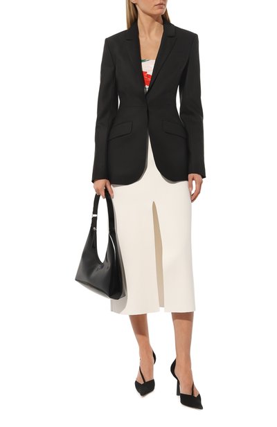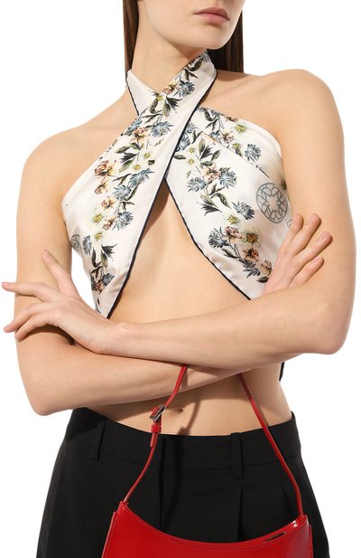 Треугольный платок, напоминающий короткую накидку, сшили из шелкового твила. Аксессуар, застегивающийся на пуговицу, декориров али графичным принтом в виде женской прически с косами.