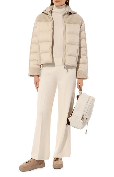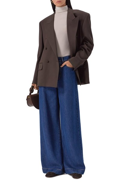 Облегающую водолазку выполнили из тонкого шерстяного трикотажа в фактурную полоску. Лаконичная универсальная модель удачно впишется в базовый гардероб.