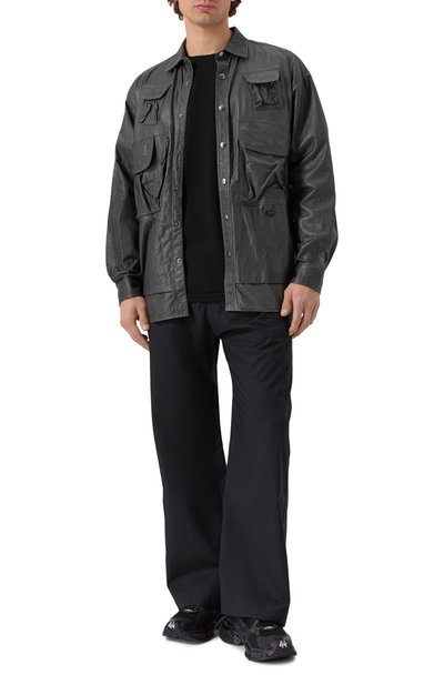Свободную однотонную футболку декорировали крупной брендированной деталью, имитирующей антикражную метку. Для пошива модели со спущенной линией плеч использовали мягкое джерси из чистого хлопка.