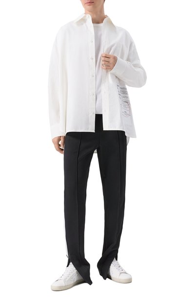 Брюки с регулируемым поясом-кулиской и застроченными стрелками спереди сшили из плотного стрейчевого хлопка. Модель дополнили боковыми карманами с клапанами на пуговицах и прорезными задними, на одном из которых – фирменный штрихкод.