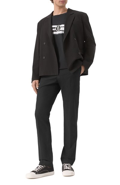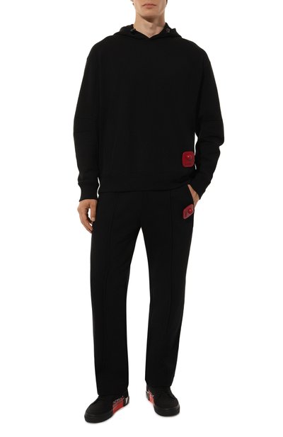 Брюки прямого кроя выполнили из хлопкового твила стрейч. Широкий эластичный пояс и низ брючин дополнили кулисками. Модель со стрелками и тремя карманами украсили сзади логотипом бренда в тон.