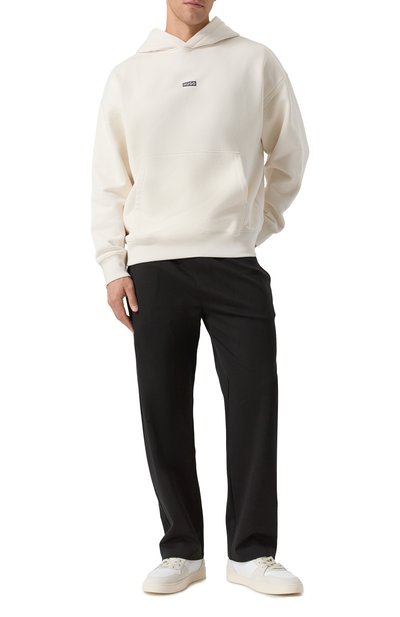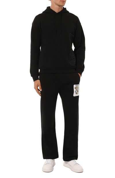 Немного укороченные брюки прямого кроя выполнили из хлопкового твила стрейч. Модель дополнили двумя задними и двумя боковыми карманами, разместив вдоль левого контрастную вышивку с логотипом бренда и надписью Couture!.