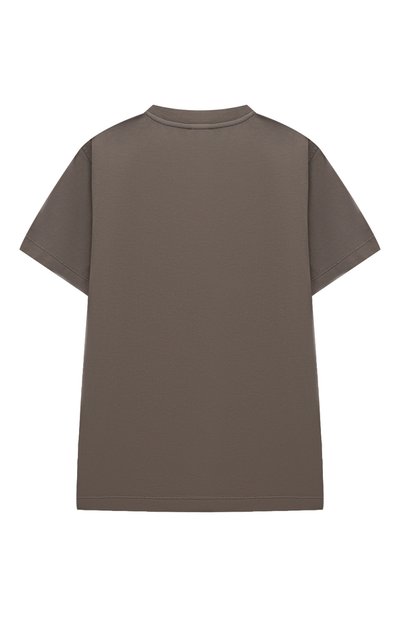 Прямую серую футболку сшили из хлопкового джерси, безопасного даже для очень чувствительной кожи. Спереди модель украсили множеством надписей, создающих черно-белый шахматный мотив.