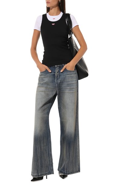 Широкие джинсы с защипами спереди выбелили и декорировали заломами и потертостями, чтобы придать сходство с винтажной одеждой. Брюки из денима с добавлением лиоцелла наши стилисты предлагают носить с кроп-топом, парной рубашкой и туфлями.