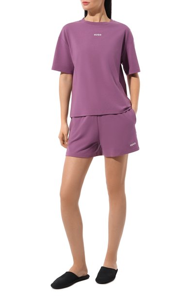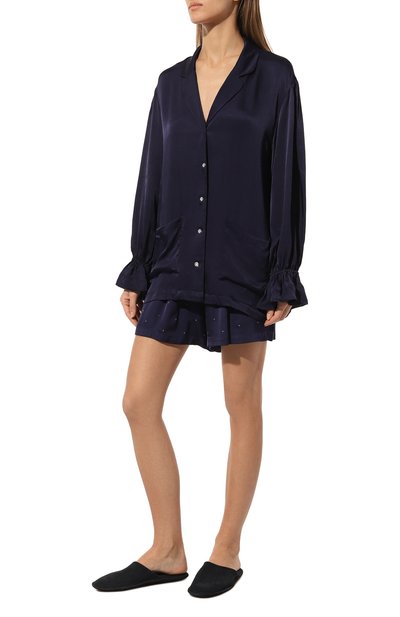 Голубые шорты выполнили из тонкого хлопкового материала. Изделие декорировали нашивкой с логотипом бренда на эластичном поясе и перламутровыми пуговицами, имитирующими гульфик. Предлагаем создать непринужденный образ с рубашкой и шлепанцами в тон.