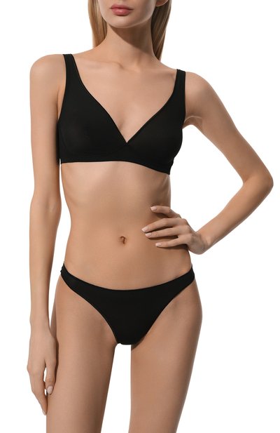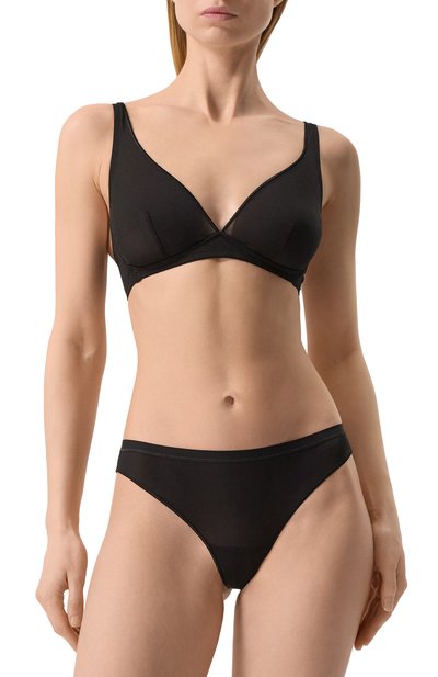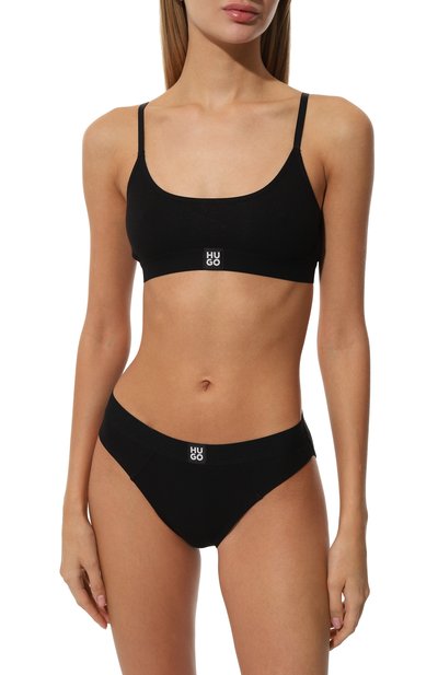 Трусы-танга сшили из эластичного трикотажа на основе шелковистого модала, который пропускает воздух не хуже хлопка. Широкий плоский пояс украсили спереди патчем с контрастным логотипом.
