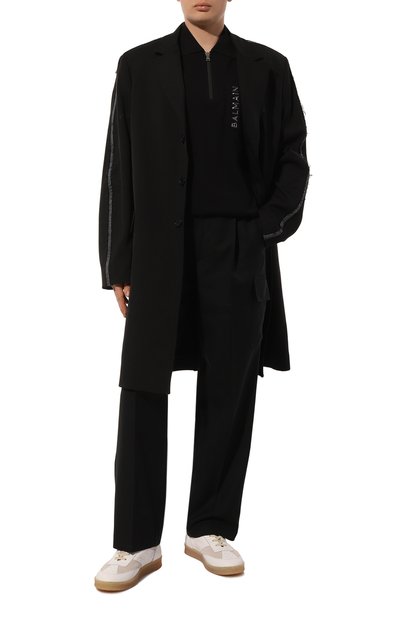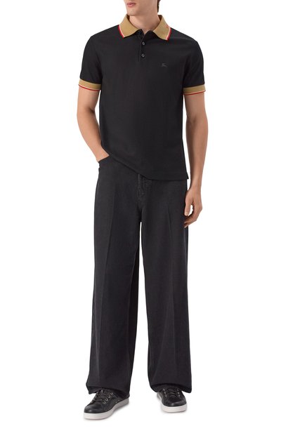 Вязаное поло силуэта Tight fit выполнили из пряжи, в состав которой входят хлопок и лиоцелл. Отложной воротник выделили контрастной полоской. Такие же есть на ребристых манжетах и поясе. Декор гармонирует с вышивкой на нагрудном кармане.