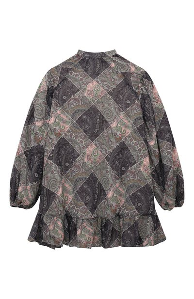 Для пошива рубашки использовали трикотаж на основе вискозы с добавлением сияющих нитей, а для подклада выбрали мягкий хлопок. Изделие с эластичными манжетами и подолом застегивается на разноцветные пуговицы.