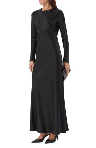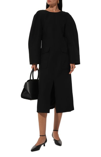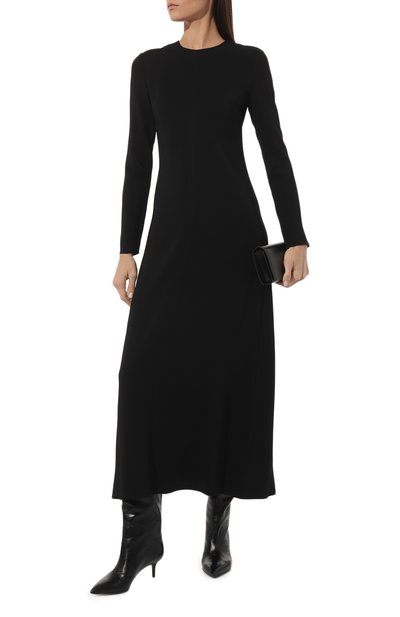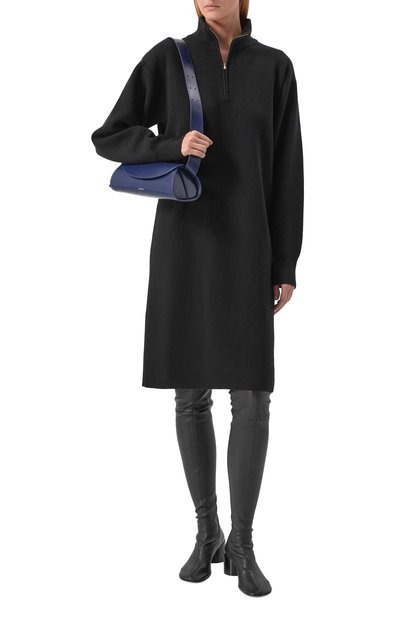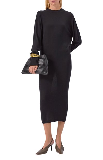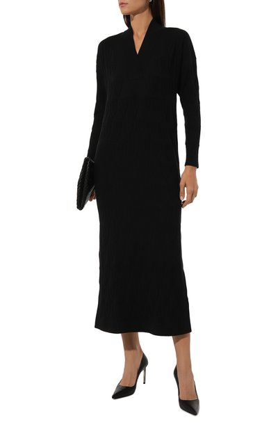 Платье с широкой рифленой отделкой по низу, рифмующейся с манжетами и высоким воротом, наши стилисты предлагают носить ботильонами и пальто. Свободную модель с рукавами реглан связали из полушерстяной пряжи с добавлением шелка и кашемира.