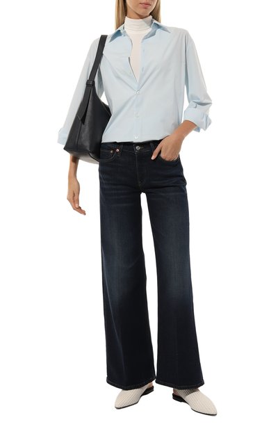 Для изготовления широких джинсов с пятью карманами использовали слегка эластичный хлопок с эффектом делаве. Сзади модель дополнили брендированным патчем и небольшой вышивкой Love Birds.