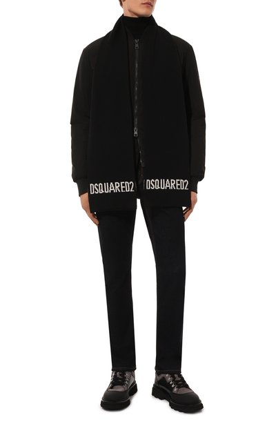 Черный шарф плотностью 14 петель на дюйм выполнили из микса шерсти и акрила. Над ребристыми концами вывязали фирменный числовой код. Декор повторили на белой стороне аксессуара.