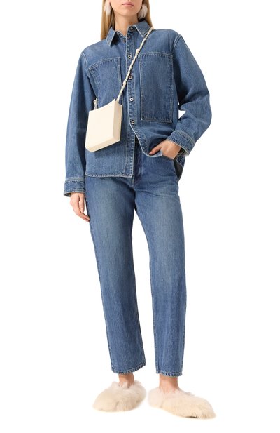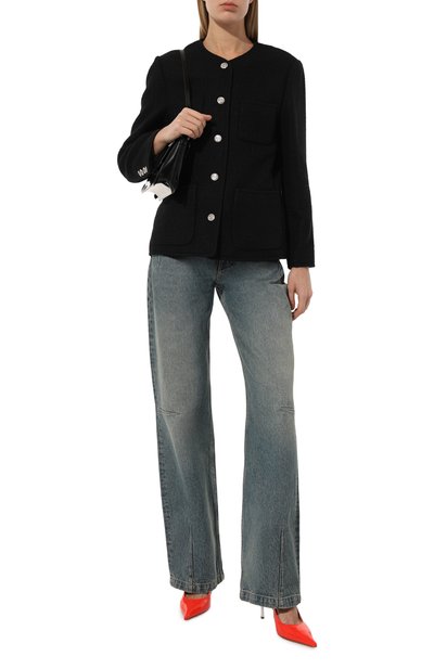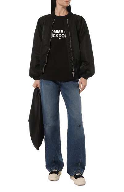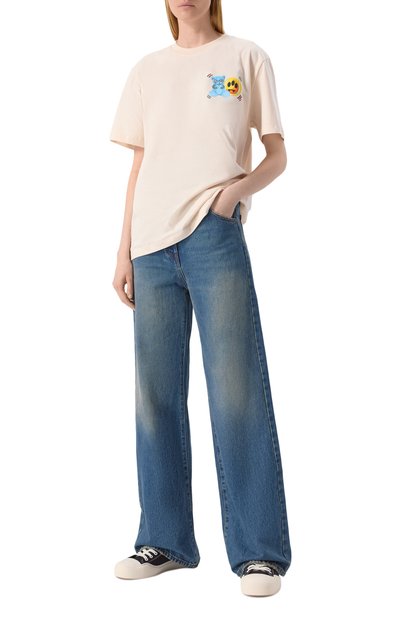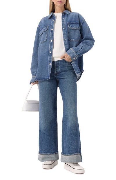 Для пошива расклешенных свободных джинсов с пятью карманами и акцентными швами спереди использовали хлопок с потертостями и заломами. Изделие украсили сзади фирменным белым швом, а пояс дополнили патчем с числовым кодом.