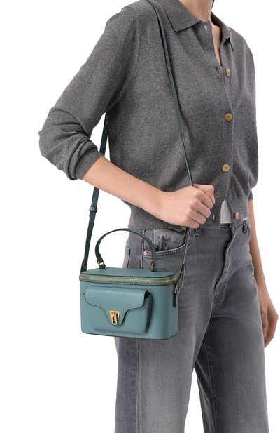 Для пошива сумки Arlettis на магнитной кнопке использовали зернистую кожу оттенка Azul. У аксессуара предусмотрели один внутренний карман и два наружных: с молнией на задней панели и с клапаном, закрывающимся фирменным замком, на передней. В комплекте – съемный регулируемый ремень.