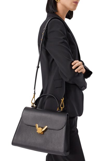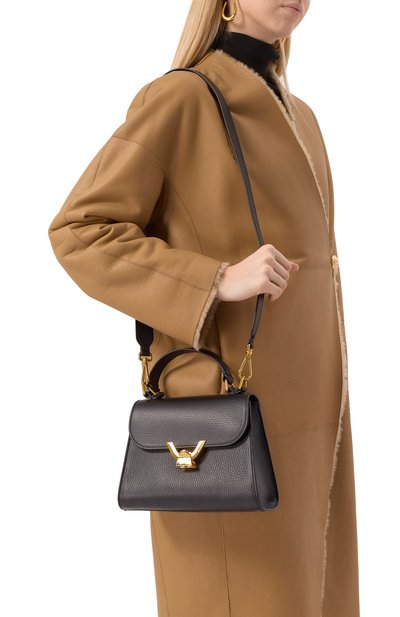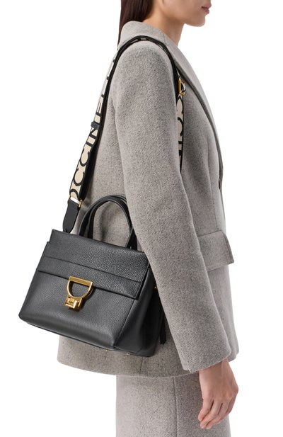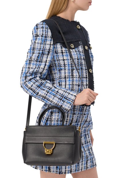 Сумка Arlettis с короткими ручками и съемным плечевым ремнем выполнена из зернистой кожи. Внутреннее отделение с двумя слотами и отсеком для ноутбука 12 дюймов закрывается магнитной кнопкой, а внешние карманы — молнией и фирменным замком.