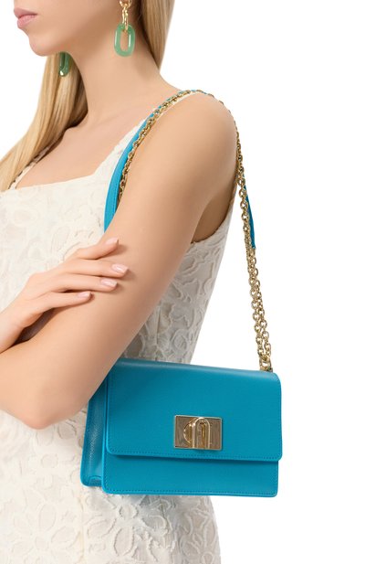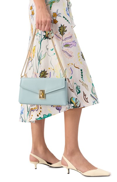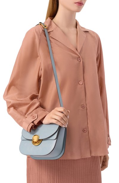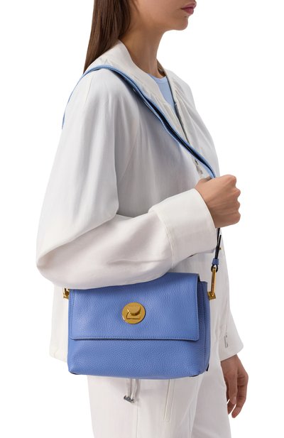 Сумку Dew оттенка Azul изготовили из крупнозернистой кожи. Аксессуар со съемным регулируемым плечевым ремнем закрывается пряжкой в форме плектра. Внутри — три отделения и пара карманов, один из которых застегивается молнией.