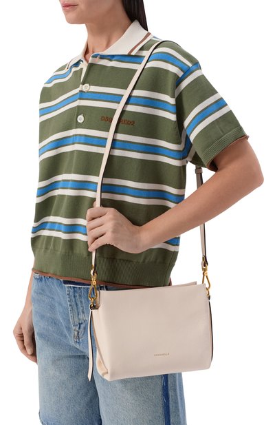 Сумку Aura из крупнозернистой кожи украсили небольшим золотистым логотипом. Внутри предусмотрели три карточных слота. Аксессуар со съемными ручкой-цепочкой и регулируемым ремнем застегивается молнией.