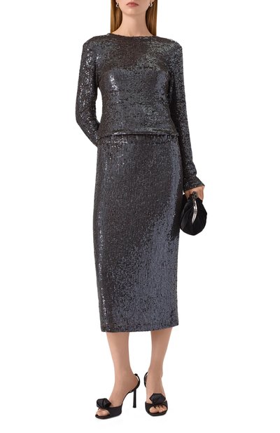 Топ выполнили из эластичного полиэстера с металлическим блеском. Глубокое V-образное декольте подчеркнули цепочкой, которую продели в вертикальную кулиску спереди, создав драпировку. Изделие можно сочетать как с брюками в тон, так и с джинсами.